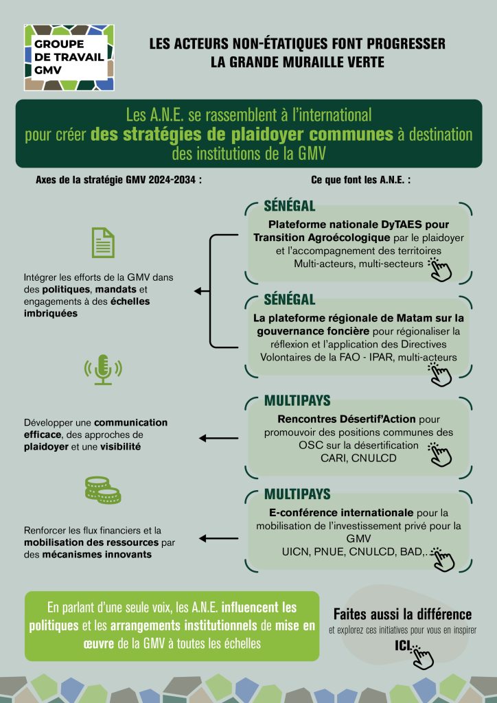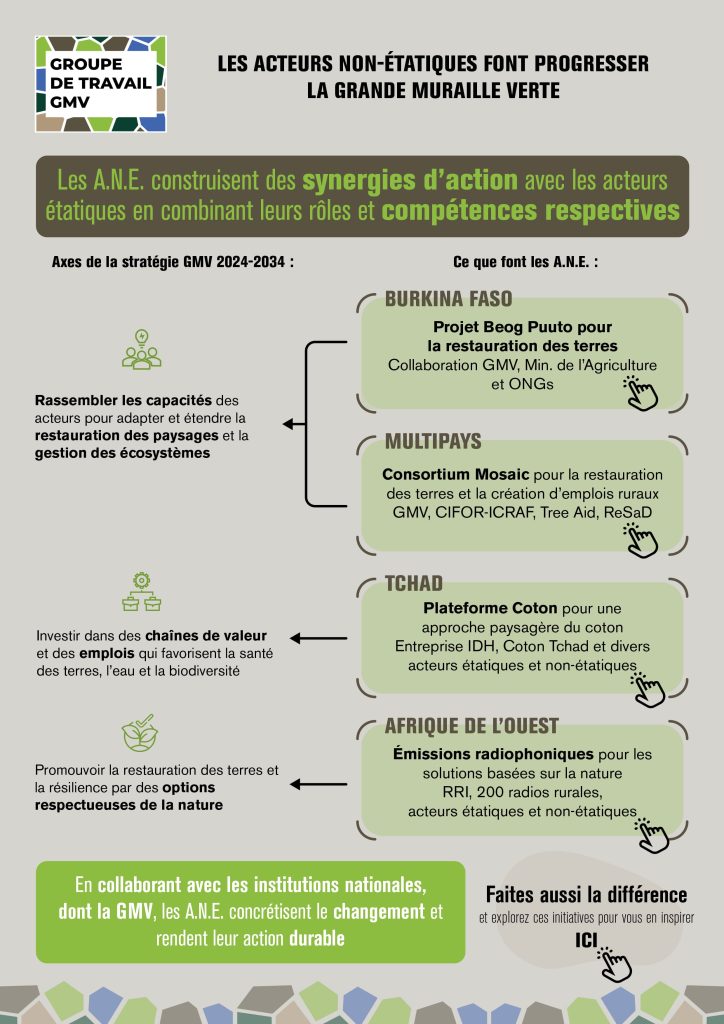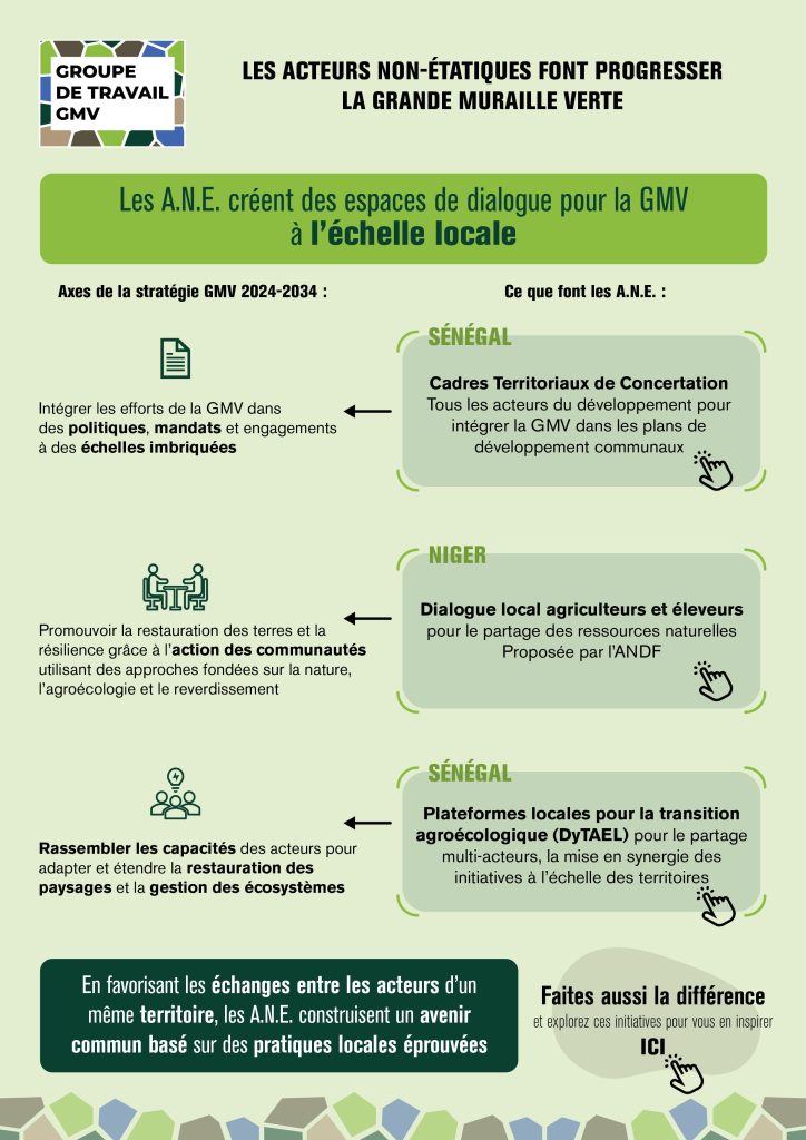 Avec une telle ambition, la Grande Muraille Verte est avant tout un projet collectif. Il est piloté par les agences nationales et l’agence panafricaine, qui ont besoin des partenaires techniques et financiers, mais aussi des Acteurs Non Étatiques (A.N.E.) qui ont un rôle essentiel à jouer sur le terrain. Pour jouer collectif, nous avons créé un groupe régional de travail des acteurs non-étatiques (A.N.E.) de la Grande muraille verte, avec pour objectif d’améliorer l’implication de tous les acteurs dans la gouvernance et la mise en œuvre de cette grande initiative.